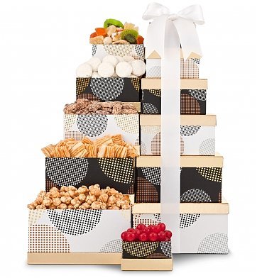 An elegant array of gourmet confections and savory snacks come together to both surprise and delight the recipient. Six distinctive stackable boxes open to reveal hidden treasures like Hathaway's Fruit Pastilles, gourmet Toffee Caramel Popcorn and powder sugar dusted lemon cookies. The crowning glory of this gourmet tower is the Macadams' Island Mix, a combination of dried tropical fruits and premium nuts. Simply delicious! With this tower gift's impressive presentation and balanced mix of gourmet flavors, it is sure to add a feeling of festivity to any occasion or special moment. Measures 18" H.